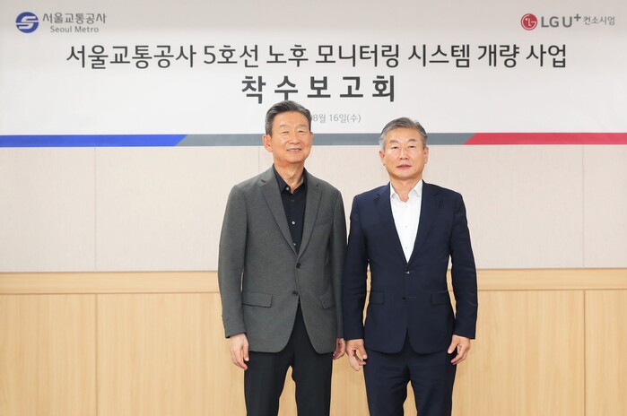 ▲LG유플러스 황현식 대표(사진 왼쪽)와 서울교통공사 김성렬 기술본부장(오른쪽)이 착수보고회에서 기념 촬영을 하는 모습. |