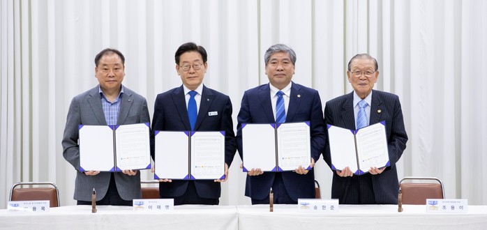 | ▲경기지방고용노동청 신설 추진 협력 협약(왼쪽부터 김용목 한국노총경기지역본부 의장, 이재명 경기도지사, 송한준 경기도의회 의장, 조용이 경기경영자총협회 회장)./경기도 제공. |