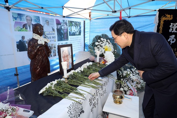 이날 故 김복동 할머니의 추모고별식에 참석한 허 시장은 추모사를 통해 “마지막 돌아가시는 순간에도 ‘위안부 문제 끝까지 싸워 달라’는 말을 잊지 않고 기억하겠다”며 “할머니의 용기 있는 삶이 헛되지 않도록 일본의 사과를 받아내는 날이 오기를 간절히 바란다”고 밝혔다.