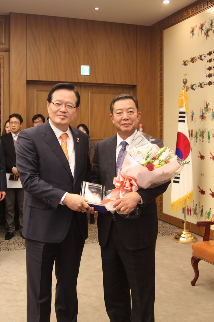 ▲29일 이찬열 의원(오른쪽)이 국회사무처 선정 우수의원상을 수상한 뒤 정의화 국회의장과 기념촬영을 하고 있다. ©로컬세계 |