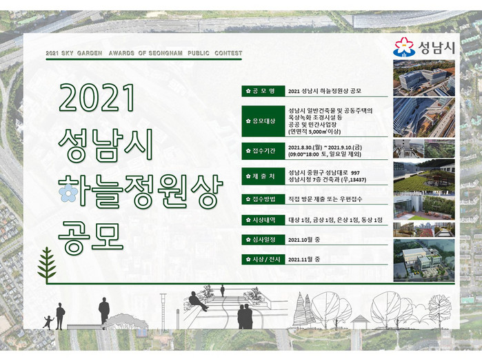 시는 지난해 이 공모로 LH 판교 제2테크노밸리 기업성장센터(대상), 서현도서관(금상), 중앙공설시장(은상), 위례 한화 오벨리스크 센트럴스퀘어(동상)를 선정해 각 건축물 건축주, 설계자, 시공자에게 ‘제2회 성남시 하늘정원 상장’을 줬다.