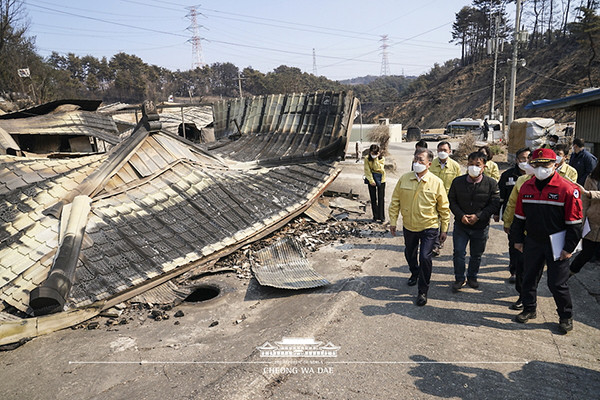 | ▲6일 경북 울진군 신화2리에서 문재인 대통령과 관계자들이 화재 피해 현장을 살펴보고 있다.(사진=청와대) |