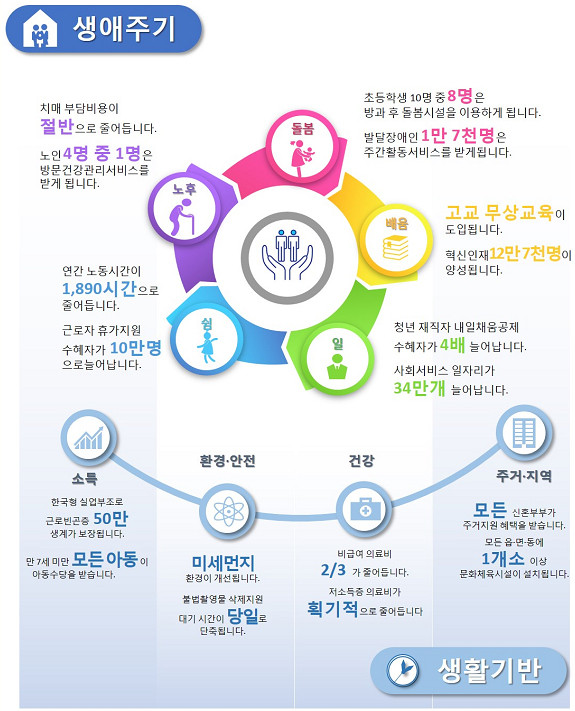 이에 따라 정부는 돌봄·배움·일·쉼·노후 등 생애주기별 필요한 지원을 강화하고 소득·환경·안전·건강·주거 등 기본적인 생활기반 분야에서 소외되거나 피해를 받는 사람이 없도록 사회적 안전망을 구축한다는 계획이다.