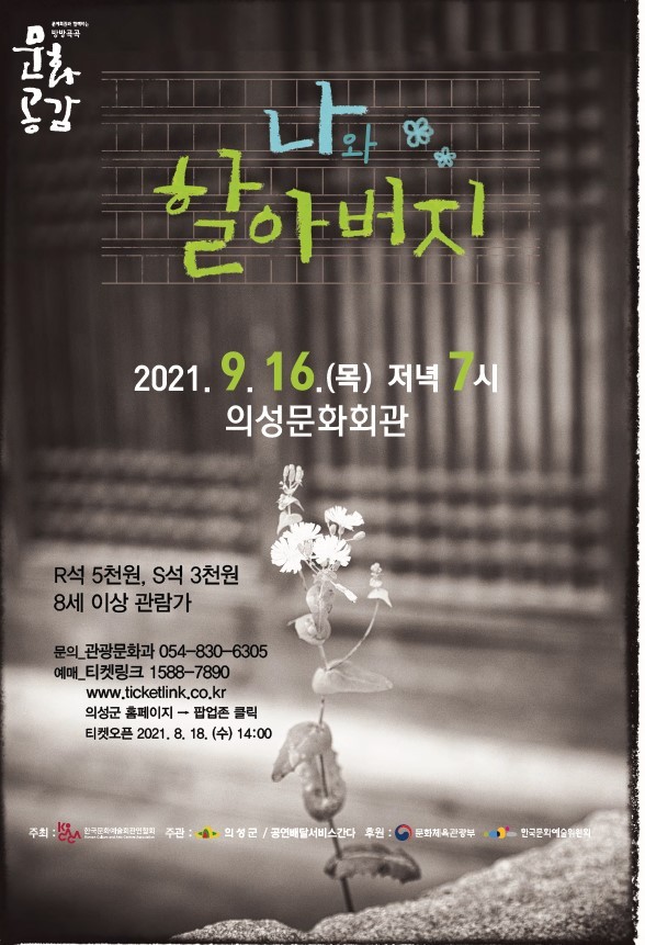 [로컬세계 박상진 기자]경북 의성군은 문화예술회관연합회가 주관하는 ‘2021년 문예회관과 함께하는 방방곡곡 문화공감 사업’ 선정작 중 두 번째 공연으로 연극 ‘나와 할아버지’를 오는 16일 저녁 7시에 의성문화회관에서 선보인다.