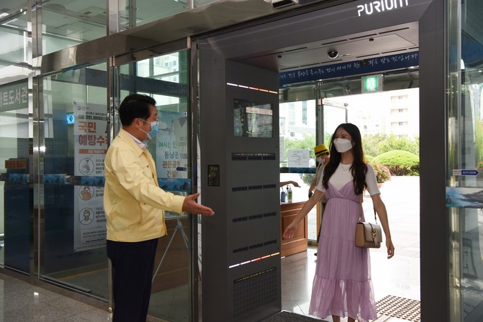 공항 보안 검색대와 비슷한 모양의 ‘스마트 에어샤워’는 출입자의 몸과 옷, 휴대폰 등에 묻은 바이러스와 미세먼지를 흡입해 제거한다. 기기를 통과하는 사람의 발열여부를 자동으로 체크하고 QR코드로 출입자를 파악하는 기능도 한다.