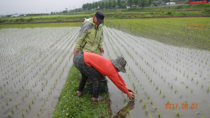 | ▲논에 왕우렁이를 투입하고 있는 농민들. |