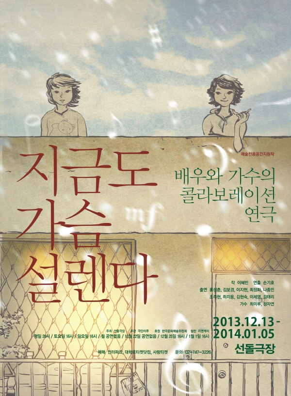 연극 <지금도 가슴 설렌다>는 1월 5일까지 서울 대학로 선돌극장에서 평일 오후 8시, 토요일과 일요일에는 오후 4시(월 공연 없음, 12월 22일 공연 없음, 12월 25일 오후 4시, 1월 1일 오후 4시)에 공연된다.