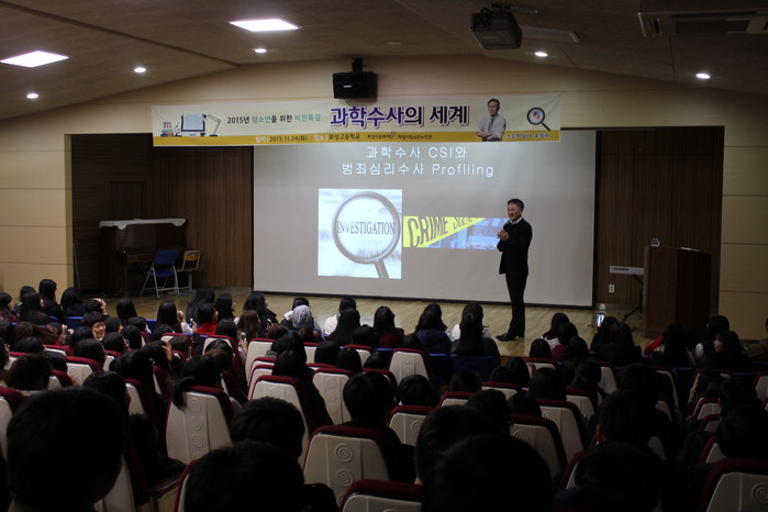 표창원 씨는 지난 24일 ‘과학수사의 세계’라는 주제로 실제 범죄사례를 예로 들어 과학수사와 프로파일링의 세계에 대한 이야기를 들려주고 또 다른 세계로 나아가기 직전인 고3 청소년들에게 정의에 대한 내용을 전달했다.