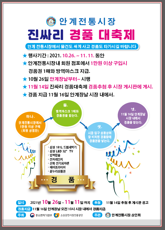 안계전통시장 상인회는‘안계전통시장 진싸리 경품대잔치’를 통해 다음달 11일까지 안계전통 시장을 방문하는 고객들에게 물품 1만원이상 구매 시 경품추첨권 및 방역마스크를 지급하고 11월 14일 추첨하여 드럼세탁기, TV, 압력밥솥 등 푸짐한 상품을 지급할 예정이다.