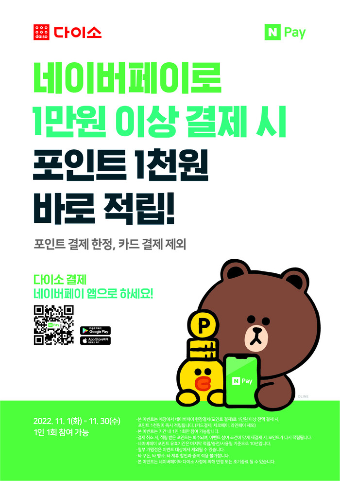 이번 이벤트는 11월 한 달 간 진행되며, 다이소 매장에서 ‘네이버페이 포인트’로 1만 원 이상 결제 시, ‘네이버페이 포인트’ 1천원을 즉시 적립해준다. 결제 완료 후 포인트 뽑기 추가 혜택도 제공된다. 이벤트 기간 동안 1인 1회 참여 가능하고, 일부 매장에서는 이벤트를 진행하지 않는다. 자세한 사항은 샵(#)다이소 앱에서 확인할 수 있다.