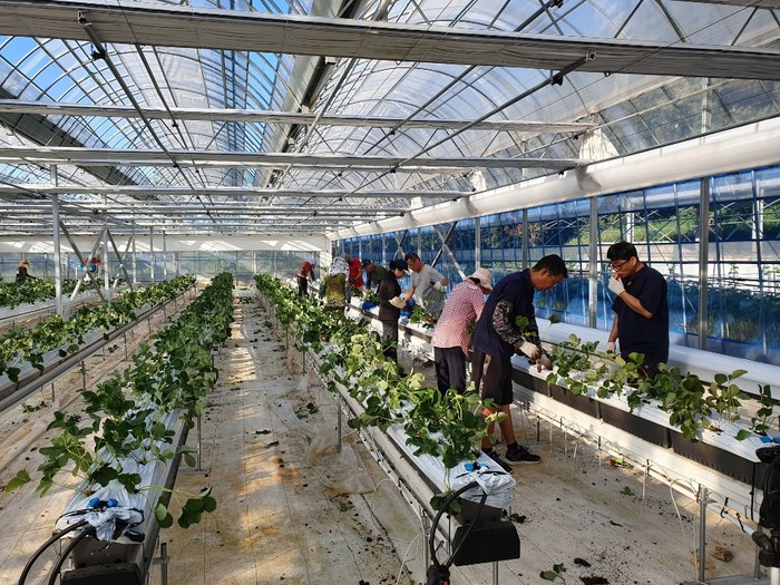 앞서 지난달 중순께 체류형 입교생 20여명은 농업창업지원센터 공동실습하우스(979㎡)에 딸기 정식을 완료했다. 현재는 뿌리가 활착해 잎이 뻗어 나오고 있는 상태다.