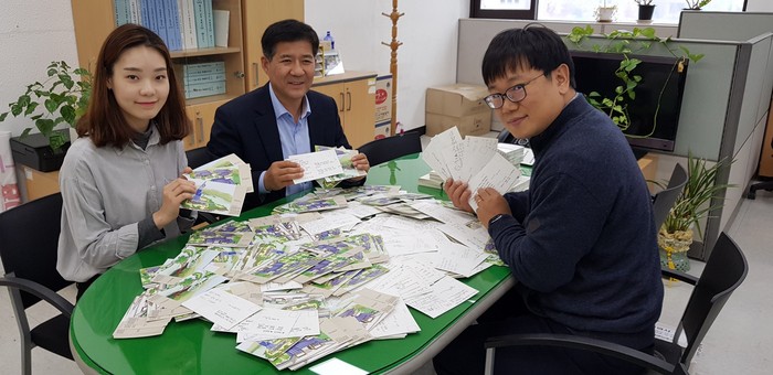 | ▲황규종 창원시 관광과장과 직원들이 느린우체통에 접수된 엽서들을 분류하고 있다.(창원시 제공) |