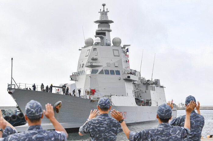▲ 29일 부산 작전기지로 입항하는 이탈리아 연안초계함 모로시니함을 향해 해군작전사령부 장병들이 환영인사를 보내고 있다. 해군작전사령부 제공 |