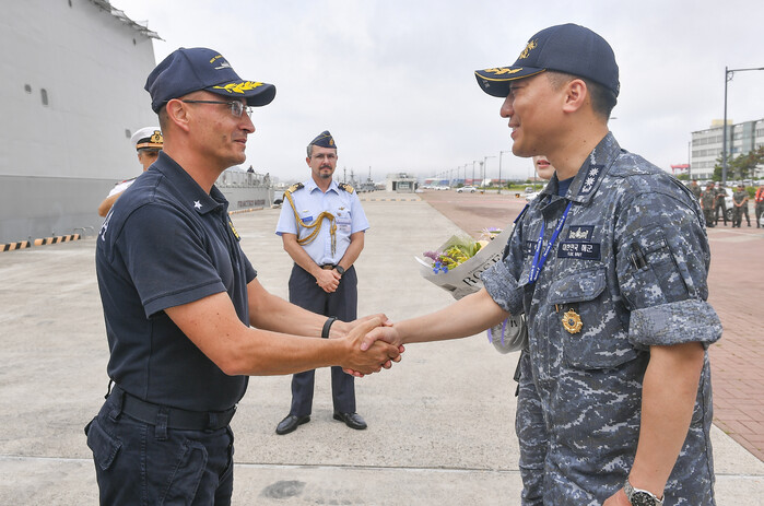 ▲ 29일 부산작전기지로 입항한 모로시니함의 함장 지오반니 모노 중령(왼쪽)과 호스트십인 천자봉함 함장 박문권 중령(오른쪽)이 만나 인사를 나누고 있다. 해군작전사령부 제공 |
