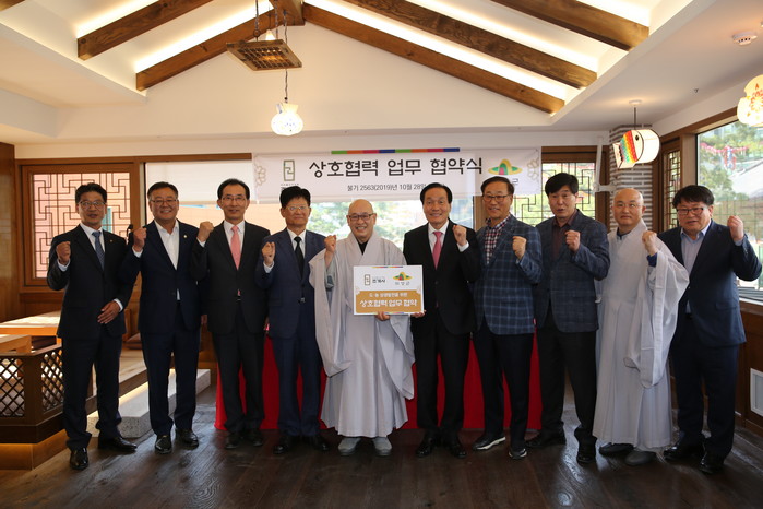 | ▲김주수 의성군수와 조계사 주지 지현스님이 ‘상생발전을 위한 업무협약(MOU)’을 체결하고 기념촬영을 하고 있다.(의성군 제공) |