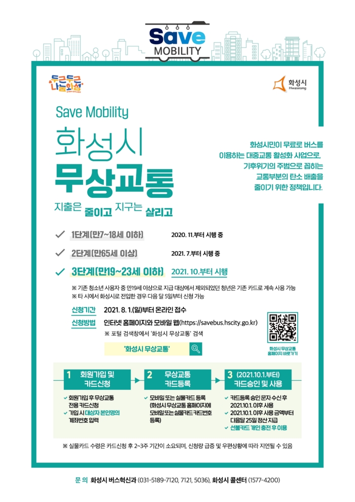 관내에서 시내 및 마을버스 이용 시 사용한 카드요금을 환급해 주는 방식이며, 이번에 대상자로 포함된 만 19세이상 23세 이하 청년은 8월 1일부터 화성시 무상교통 홈페이지에서 카드를 신청하면 된다.