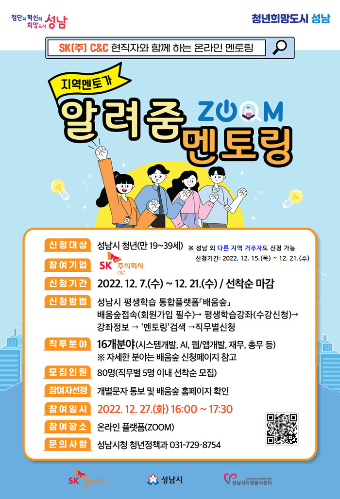 참여하려는 대학생, 취업 준비생 등 만 19세~39세의 청년은 기한 내 성남시 평생학습 포털 배움숲(평생학습강좌·수강신청→강좌정보 ‘멘토링’ 검색→직무 선택)을 통해 선착순 신청하면 된다.