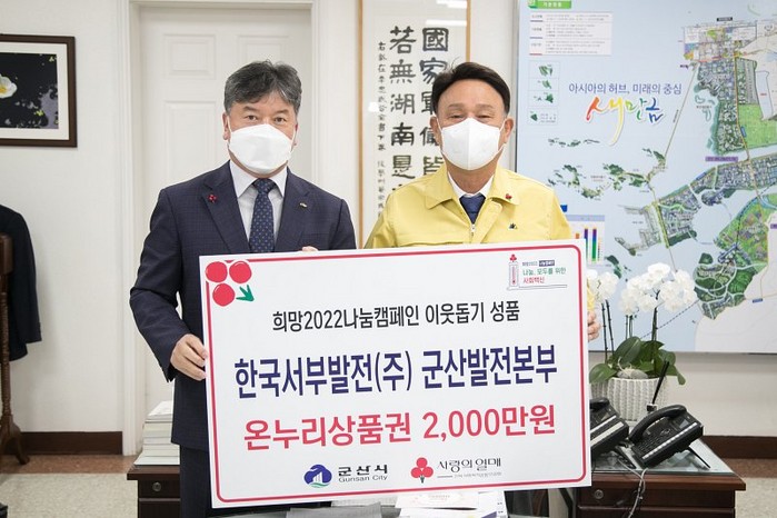 [로컬세계 양해수 기자]전북 군산시는 한국서부발전㈜ 군산발전본부(본부장 강정구)가 연말연시 어려움을 겪고 있는 이웃들을 위해 온누리상품권 2000만원을 기탁했다고 1일 밝혔다.