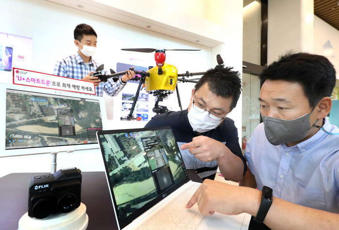 ▲LG유플러스는 U+스마트드론을 통한 ‘AI 화재감지’ 서비스가 국제공인시험기관 ‘방재시험연구원’의 검증을 받았다. 드론이 화재를 찾아내는 기기로 인정받은 것은 이번이 처음이다. 사진은 LG유플러스 관계자들이 U+스마트드론의 화재 감지 서비스를 점검하는 모습. |