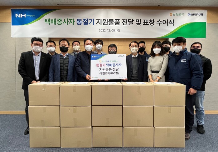 농협(회장 이성희)경제지주 계열사인 농협물류는 한진과 함께 8일 서울 광진구 동서울종합터미널에서 택배종사자에게 한파 대비 ‘방한조끼’를 전달하고 감사의 뜻을 전하는 표창을 수여하며 상생활동을 펼쳤다.