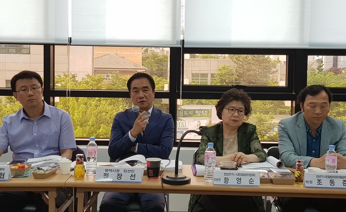 | ▲정장선 평택시장 당선인이 기획조정실 업무보고 후 환경문제 해결 의지를 밝히고 있다.(민선7기 평택시장 인수위 제공) |