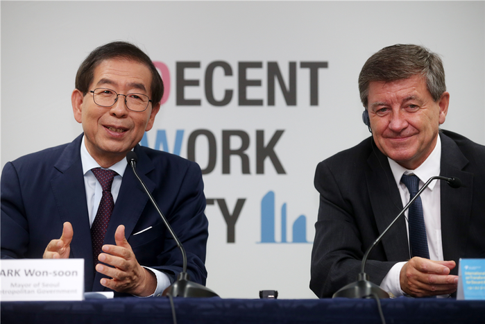 ▲지난해 '좋은 일자리도시 국제포럼'에 참석한 박원순(왼쪽) 서울시장.(서울시 제공) |