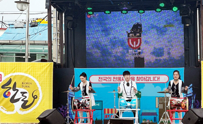 ▲지난 26일 충남 홍성군 광천전통시장에서 열린 ‘한돈과 함께하는 뽀식유랑단’ 행사에서 임형규 장구팀이 공연을 펼치고 있다. |