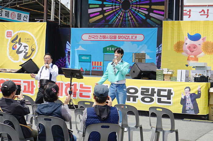 ▲지난 26일 충남 홍성군 광천전통시장에서 열린 ‘한돈과 함께하는 뽀식유랑단’ 행사에서 개그맨 이용식과 가수 원혁이 축하공연을 펼치고 있다. |
