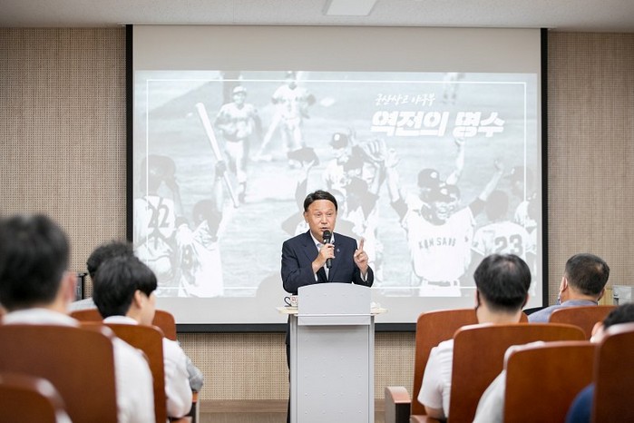 이날 초청 강사로 강연에 오른 강 시장은 강의시작과 함께 학생들과 지난 1972년도 황금사자기 결승전 영상을 시청한 후 9회말 투아웃 4:1상황에서 군산상고가 이뤄낸 역전극의 의미에 대해 설명했다.