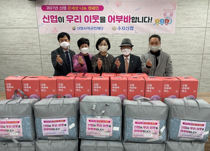 이날 전달한 물품은 겨울용 이불 10채와 라면, 통조림 등을 담은 ‘어부바 박스’17상자로, 수지신협이 지난 11월부터 ‘온세상 나눔 캠페인’을 통해 모아 마련한 것이다.