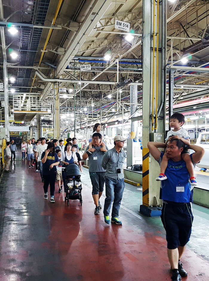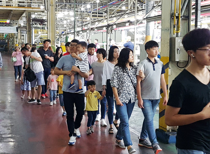 ▲참가자들이 렉스턴 브랜드 모델들이 만들어지는 평택공장 생산라인을 견학하고 있다. |