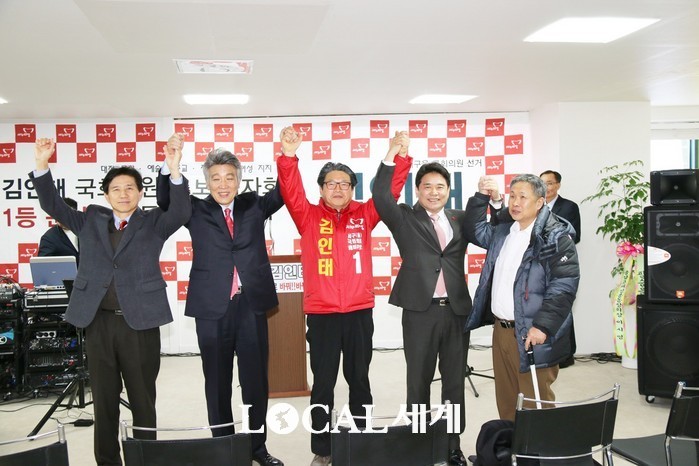 ▲김인태 예비후보(가운데)가 남충희 대전시당 창조경제특별위원장, 육동일 정책자문위원장 등과 만세삼창을 하고 있다. 오영균 기자. |