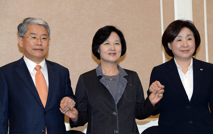 ▲김동철 국민의당 비상대책위원장, 추미애 더불어민주당 대표, 심상정 정의당 대표(왼쪽부터)가 13일 국회 귀빈식당에서 회동에 앞서 기념촬영을 하고 있다. 사진제공 더불어민주당. |