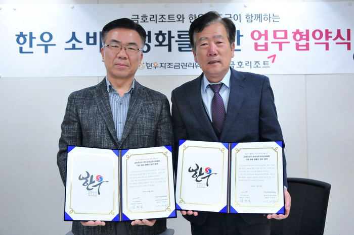 | ▲지난 29일 서울시 종로구에 위치한 금호아시아나 본관에서 진행된 한우 소비 활성화를 위한 업무협약식에서 김현일 금호리조트 대표이사(좌)와 민경천 한우자조금관리위원장(우)이 협약서를 들고 기념촬영을 하고 있다. 양 기관은 이번 협약을 기념해 금호통영마리나리조트에 한우를 활용한 요리를 출시하는 한편 향후 긴밀한 협력관계를 유지하기로 했다. |