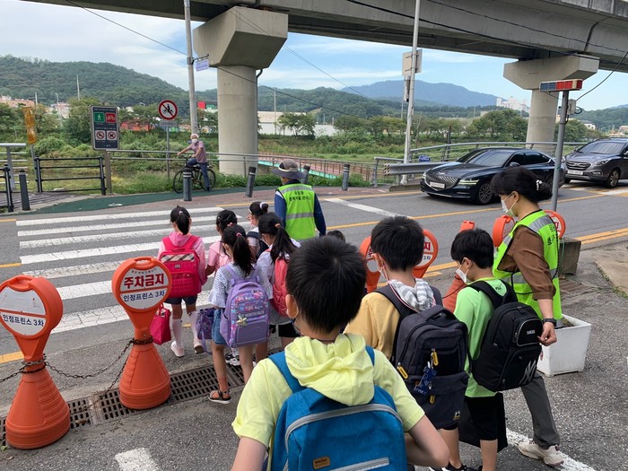 | ▲유림동 행복마을지킴이들과 동행해 등교를 하고 있는 어린이 모습. |