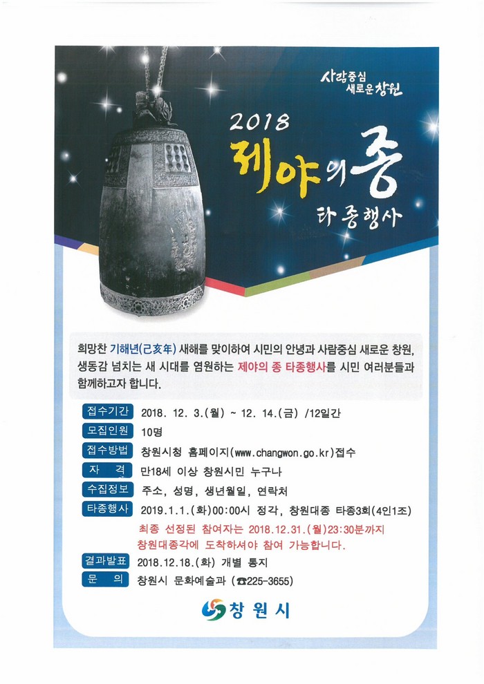 이에 앞서 타종 참여를 희망하는 만 18세 이상의 창원 시민이면 3일부터 14일까지 시 홈페이지(http://www.changwon.go.kr)에서 누구나 신청 할 수 있으며, 추첨을 통해 최종 10명이 선정될 예정이다.