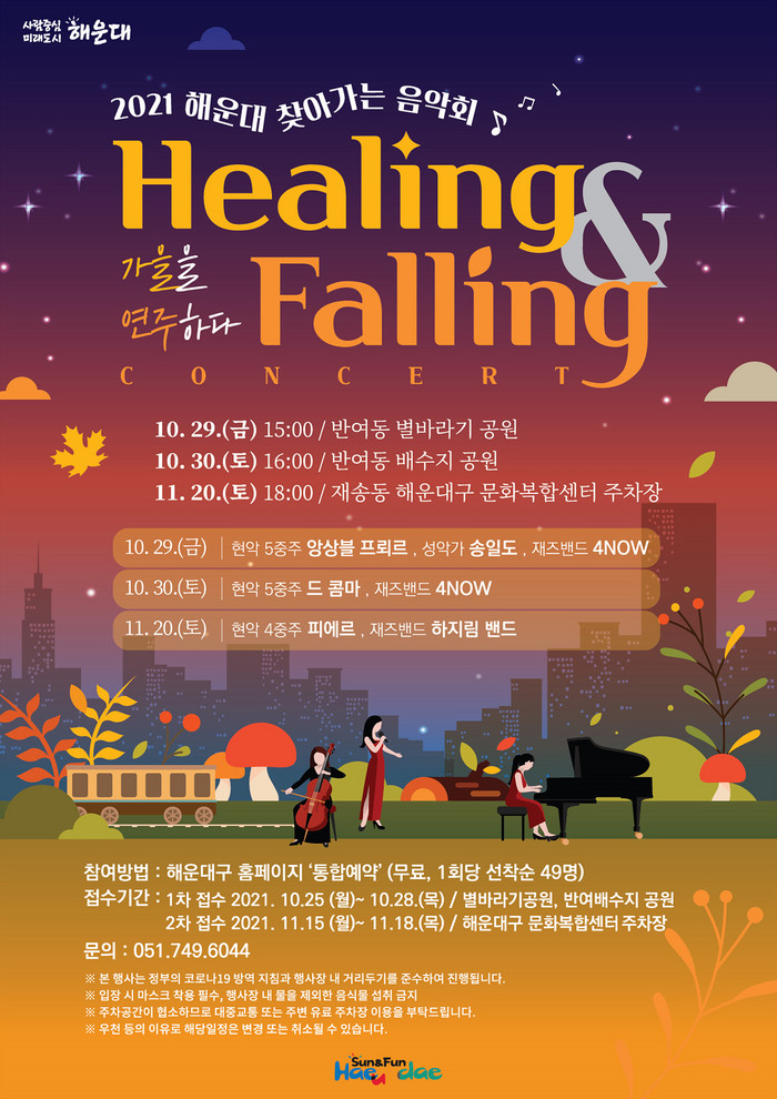 참가 신청은 해운대구청 홈페이지 ‘통합예약’에서 하면 되고, 현장에서 참여할 경우 마스크를 착용해 1m 이상 거리를 두고 공연을 관람하면 된다.