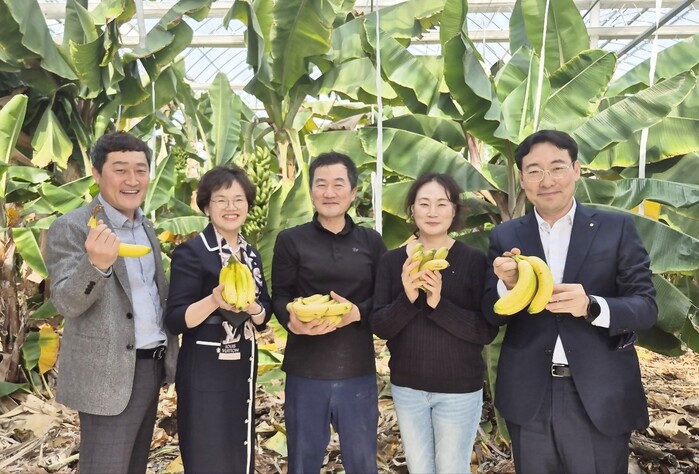 ▲ 조은주 상무(왼쪽에서 두번째) 와 포항센터 직원들이 만강바바나 대표 부부와 바나나를 들고 사진을 찍고 있다. 농협 제공 |