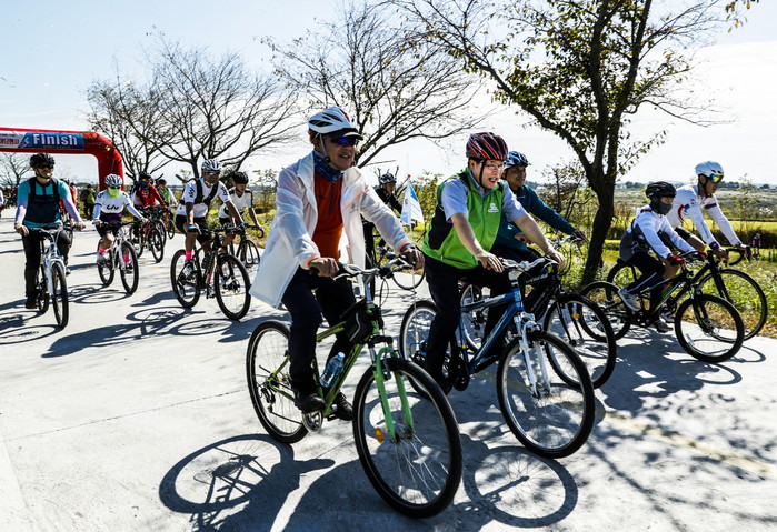 이날 익산시민 200여 명은 만경강 사수정쉼터에서 출발해 공덕대교를 반환점으로 되돌아오는 약 10km 코스를 달리면서 만경강 자전거길 주변의 아름다운 가을 풍경과 함께 인증사진을 남기는 등 자전거를 타고 시원하게 달려보는 시간을 가졌다.