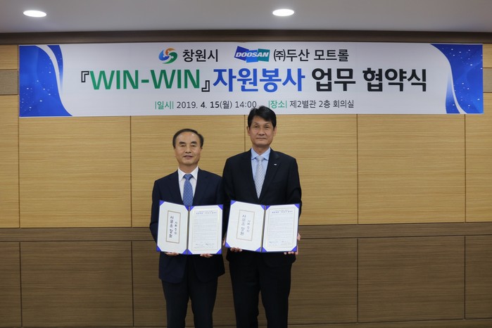 | ▲창원시는 15일 두산모트롤과 ‘기업과 함께하는 WIN-WIN 자원봉사 협약식’을 가졌다.(창원시 제공) |