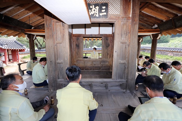 19일 오전 유기상 고창군수가 아산면 삼호정(전북 유형문화재 279호)에서 국·과·관·소장 등 30여명이 참석한 현안회의를 열었다.