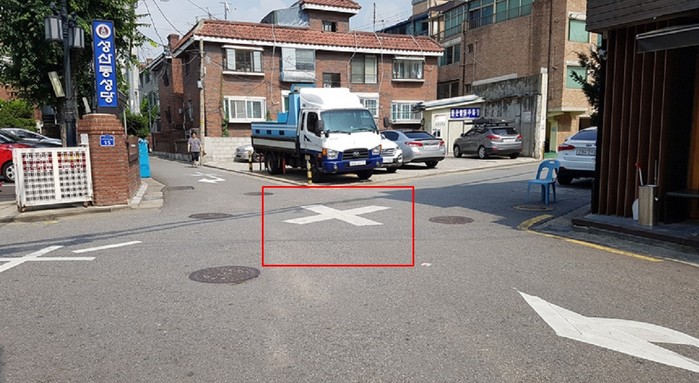 ▲성산동성당 앞 도로에 +자형 교차점이 표시돼 있다. |