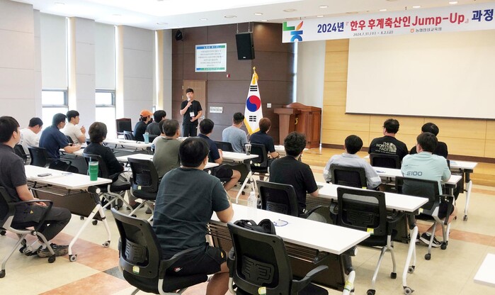 ▲지난달 31일부터 8월 2일까지 농협 안성교육원에서 진행한 2024년 한우 후계축산인 Jump-Up 교육에서 청년농업인들이 관련교육을 듣고 있다. 농협 제공 |