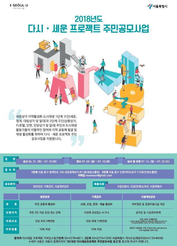 제안서 접수는 7월 9~10일까지 다시·세운 프로젝트 소통방에 직접 방문하거나 이메일(resewoon@gmail.com)로 접수할 수 있다.