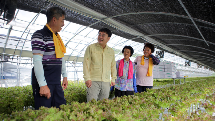 장영수 군수는 25일 번암면의 상추 농가를 방문하여 쿨 수건을 전달하며 작업자들을 격려했다.
