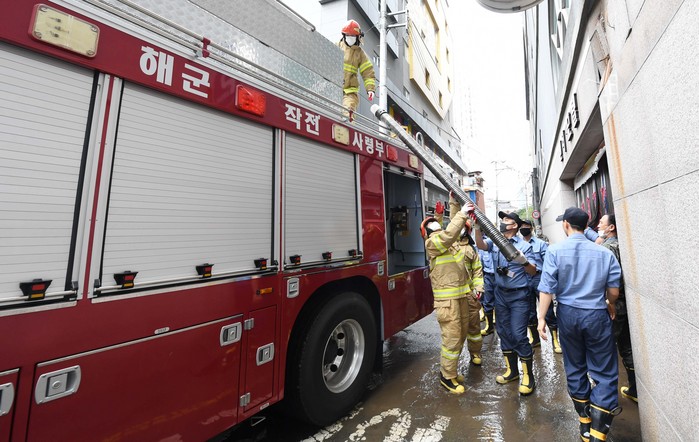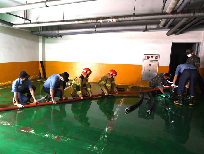 지난 23일 부산에는 시간당 최대 80mm가 넘는 폭우와 불어난 하천물로 침수피해가 곳곳에서 발생했다. 24일 오전 부산시 남구청으로부터 대민지원을 요청받은 해군작전사는 부산기지방호전대 화생방지원대 소속 장병 16명과 소방차 등 차량 3대, 양수기 2대를 긴급 투입해 피해를 입은 문현동 민가와 골동품시장을 찾아 배수작업과 폐기물 정리작업을 실시했다.