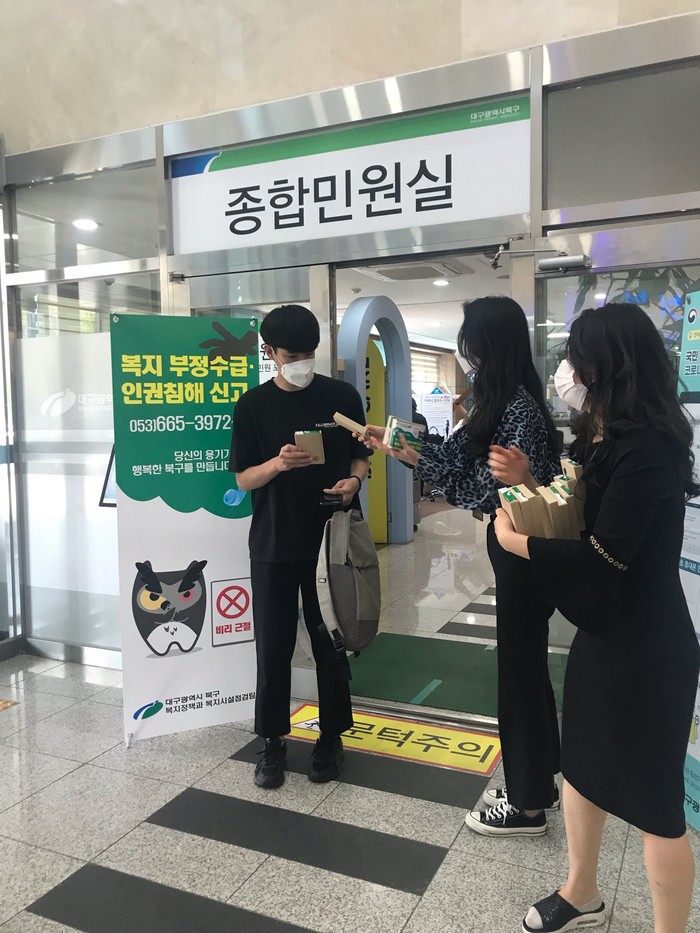 [로컬세계 박세환 기자]대구 북구청은 5일 구청 민원실에서 복지예산의 투명성과 공공성을 확보하기 위해 사회복지시설 복지부정수급 및 인권침해 방지 홍보를 주민 대상으로 실시했다.