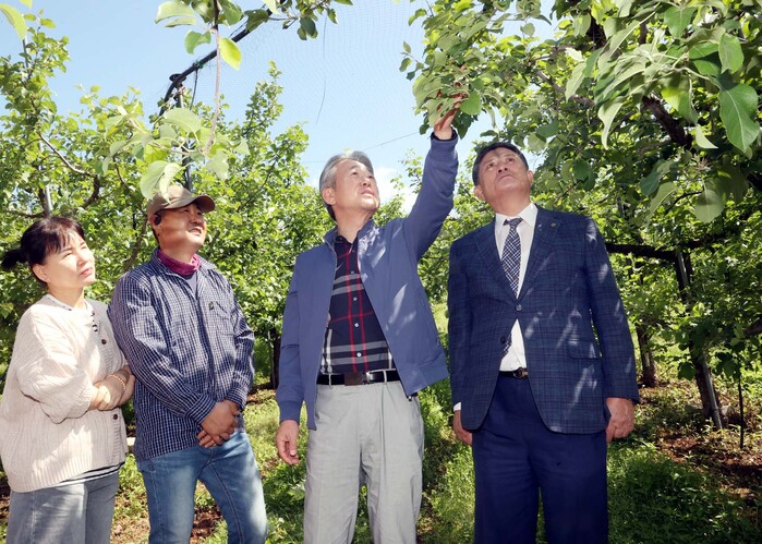 ▲강호동 농협중앙회장이 (오른쪽 두번째) 8일 전남 장성군 사과 농가를 방문하여 생육상황을 점검했다. 농협 제공 |