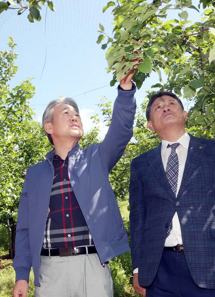 ▲강호동 농협중앙회장이 (왼쪽) 8일 전남 장성군 사과 농가를 방문하여 생육상황을 점검했다. 농협 제공 |