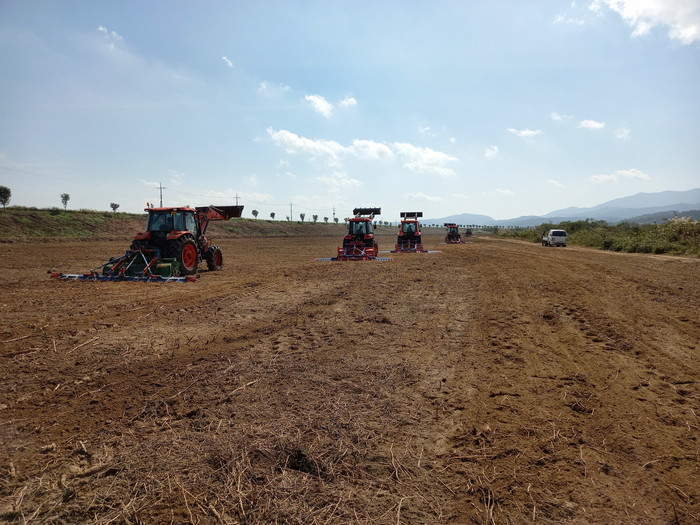 이날 단밀면 주민자치회는 제4차 정기총회를 면소재지 위천변에서 개최하고 위원들 각자가 트렉터, 비료살포기 등 장비를 준비해 약 4만평 일대에 정지작업을 한 후 파종을 실시했다.